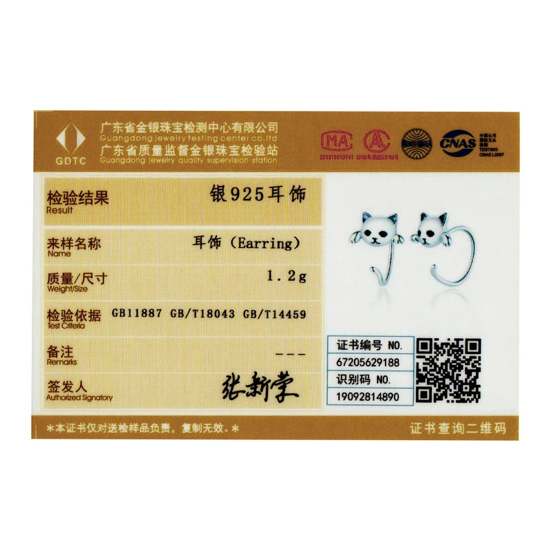 Cute Cat Stud Earrings - 925 Sterling Silver with Zircon